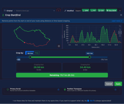 Crop based on kilometres or miles from the start and end of the route. Use this when you know exactly how much distance you want to remove.
