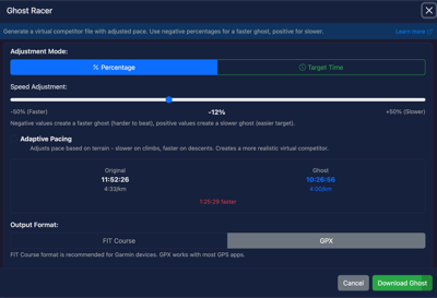 The Ghost Racer tool creates a virtual competitor from your route that you can race against on compatible GPS devices. Use it to challenge your past performance, train at a target pace, or simulate race scenarios.