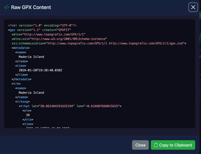GPX (GPS Exchange Format) is an XML-based file format used for storing GPS data such as waypoints, tracks, and routes. When you upload a GPX file to GPXFIT, the raw XML is parsed to extract the route information.